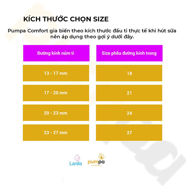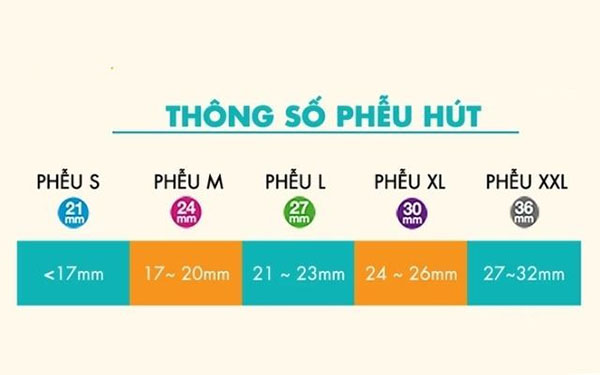 Lưu ý: ngực to hay nhỏ sẽ không ảnh hưởng tới size của phễu, size của phễu chỉ được tính toán dựa theo đường kính của núm ti theo như bảng kích thước cụ thể được gợi ý dưới đây: