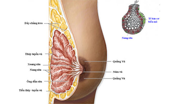 Cấu trúc của vú bao gồm 4 phần: nang sữa, ống dẫn sữa, khoang chứa sữa và mô mỡ và mô liên kết.